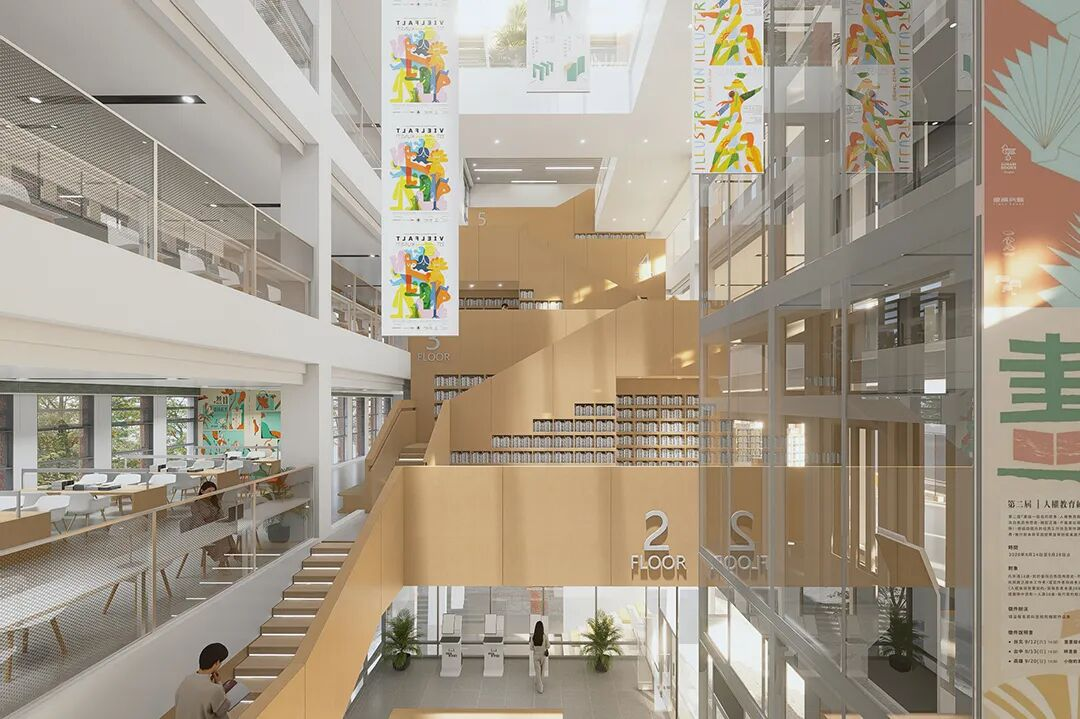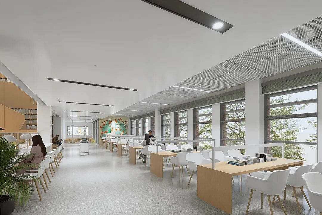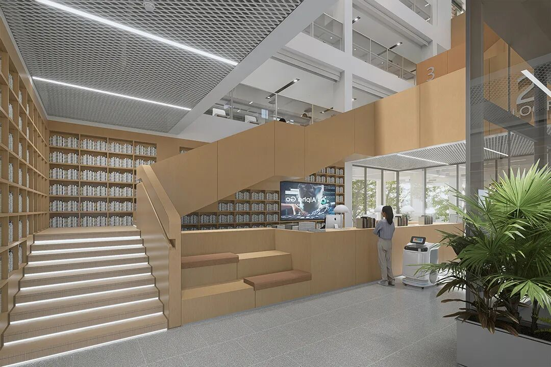 中庭引入自然天光,阶梯式阅读区营造沉浸式学习体验。
