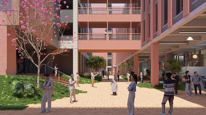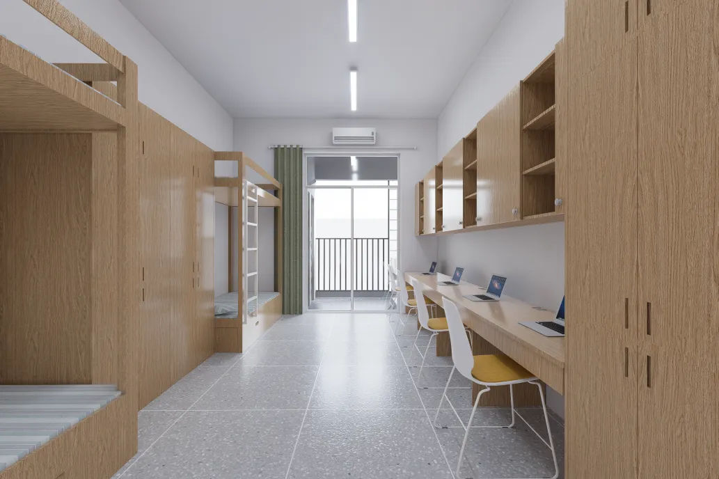 拆除原有老旧学生宿舍,新建现代化宿舍楼,底层架空释放活动空间,提升居住舒适度与生活品质。