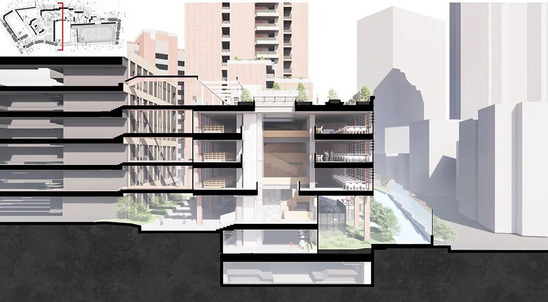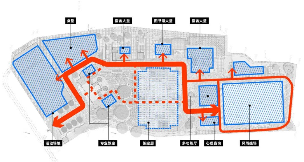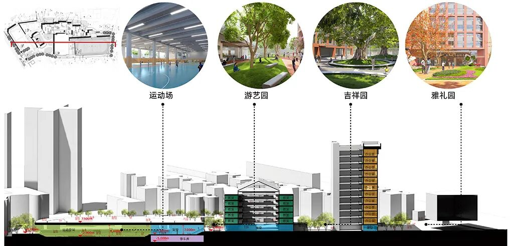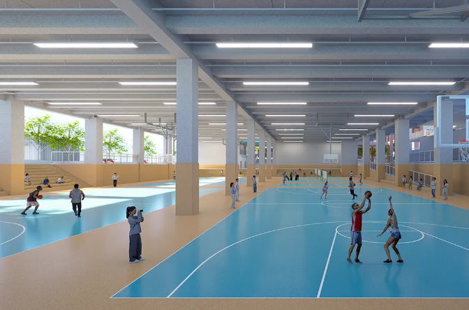 将运动场抬升至二层,下方设置风雨球场、300人报告厅、美术与音乐教室等,实现“一地多用”。