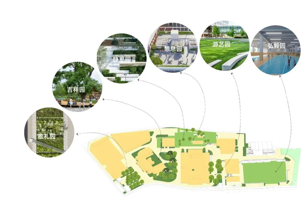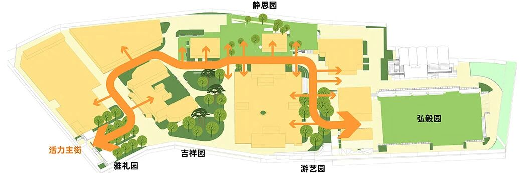 通过一条红色铺装的“活力主街”,将雅礼园、吉祥园、静思园、游艺园、弘毅园、憩息园六个主题园区串联起来,形成一条兼具通行、交流与文化展示的校园脉络。