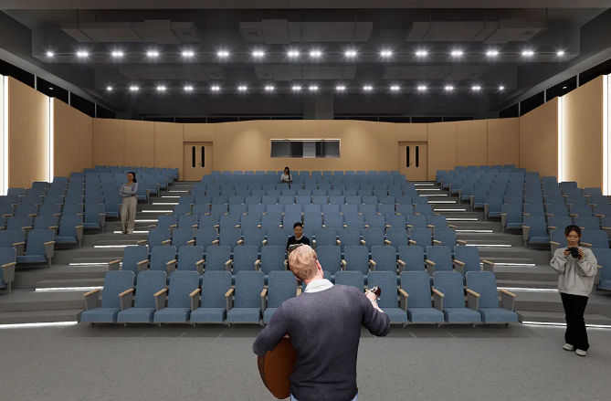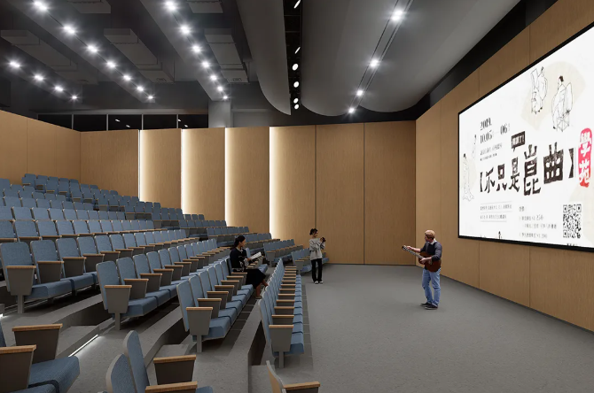 300人规模,结合自然光与木材质感,营造舒适观演环境。