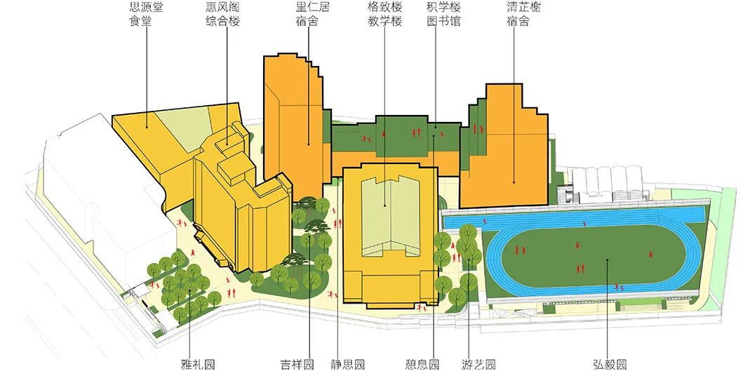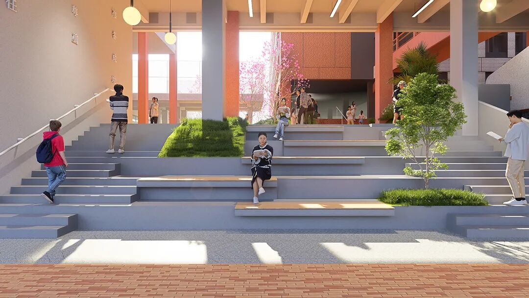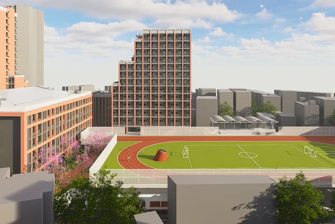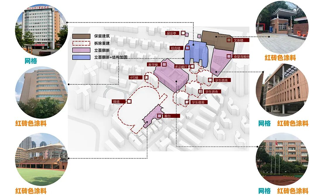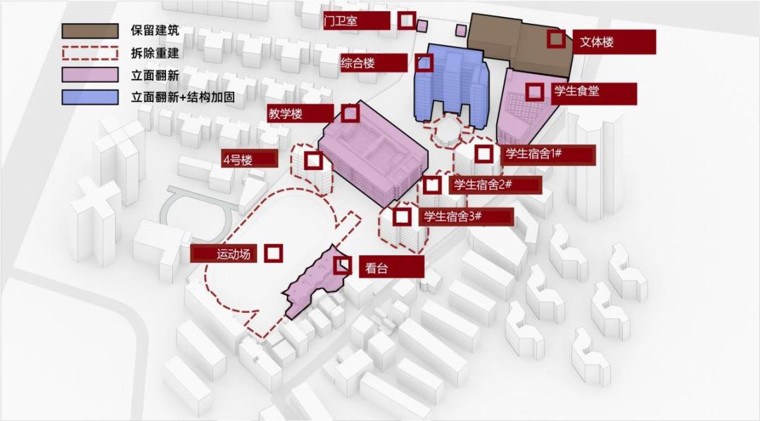 对原有综合楼进行结构加固,同步优化综合楼、食堂、看台等立面与内部功能,延续校园历史文脉。