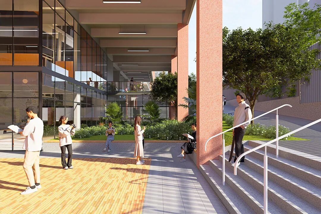 同时,通过架空层、退台、大台阶等手法,增强空间流动性,改善通风与采光,打造宜人微气候,体现对岭南地域气候的积极响应。